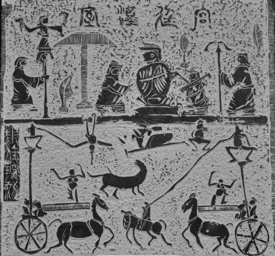 据《后汉书·礼仪志》记载,当时的傩戏要用120名穿皂服的少年,手持拨浪鼓;有戴面具披熊皮的方相,与十二兽做舞等。