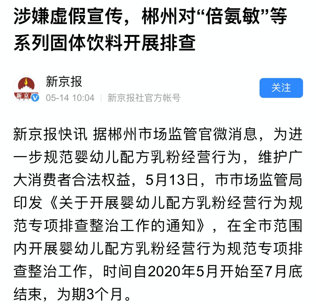 郴州市对“倍氨敏”等蛋白固体饮料开展为期3个月的全面排查 | 新京报