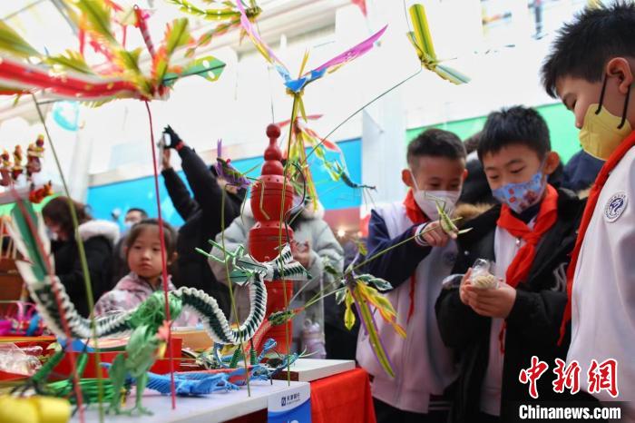 1月20日,少年儿童观看中国非物质文化遗产民俗草编制作技艺。当日,天津市第十五届娃娃庙会在天津市少年儿童活动中心(天津市少年宫)欢乐开街。“娃娃庙会”是天津市少年儿童活动中心的一项传统活动。每年春节前夕,中心都会模拟老天津卫的庙会场景,为少年儿童打造一场专属的“娃娃庙会”。 中新社记者 佟郁 摄