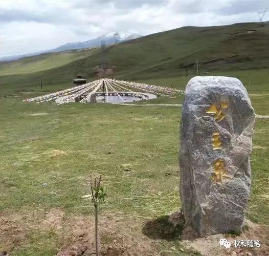 在日月山下,还能看到一口被经幡旗装饰的清泉。据说,文成公主一行走到日月山,马向西走,人却向东望,她是想再看看自己的故乡,连绵起伏的崇山峻岭挡住了她望眼欲穿的视线,但骨肉亲情,难以割舍,她不禁柔肠欲断,甚至潸然泪下,并且珠泪涟涟,转瞬泪水幻化成了一处小泉。可以想象到文成公主当时多么恋恋不舍,一定是哭得涕泗滂沱,泪如泉涌,否则泪水怎能汇聚成泉。可见并非喜极而泣,应该是悲伤至极……此泉被当地老百姓唤作颇具意境的公主泉,久而久之,便约定俗成,名声远播了。后来人们念公主之初心,特地在此泉边立一座石碑--公主泉。走到泉边,分明感受到了一种悲悲戚戚,伤心欲绝的氛围,让人魂牵梦绕,浮想联翩。这个传说既有象征意义,也给人一种凄婉缠绵的回味。可以想见封建社会中这种和亲的代价,对个人来说是多么冷酷无情,并非都是歌舞升平般美好。