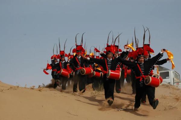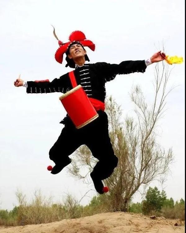 “攻鼓子”的动作皆体现出“攻”的特征。表演者为男性,头戴黑幞帽,上插两只野鸡翎,帽边插扇形白纸花,身穿黑色“十三太保衣”(夸衣),足蹬快靴,腰挎红色鼓子,双手握鼓槌。“攻鼓子”的基本打法可用“双手胸前画弧线,交错击鼓轮换翻。上步踏地凭脚力,挺胸抬头身不弯”四句口诀加以概括,充分体现出古代武士英勇剽悍、勇往直前的阳刚之气,给人以威武雄壮而又神秘莫测的美感,在当地有沙漠“黑旋风”之誉。攻鼓子的表演风格浑厚豪迈,给人以威武雄壮、粗犷豪放的美感,具有非常强烈的西部特色。