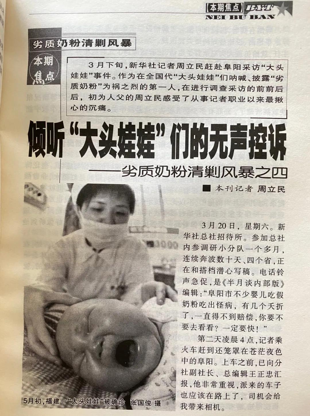 2004年6月,半月谈刊发了我的一篇采访手记《倾听大头娃娃的无声控诉》。对于怎么获得这一事件线索的,文中交待:3月20日,在新华社总社招待所接到一个电话,“电话铃声急促,是一位《半月谈内部版》编辑:‘阜阳市不少婴儿吃假奶粉吃出怪病,有几个夭折了,一直得不到赔偿,你要不要去看看?一定要快!’”