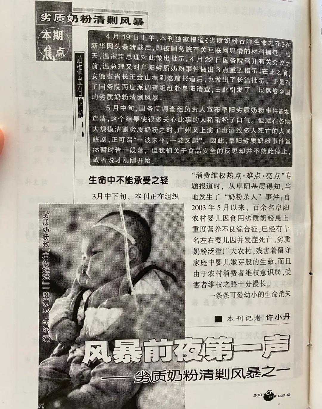 惭愧的是,这些年虽给半月谈写了一些稿件,但大多连自己都淡忘了,唯有2004年采写劣质奶粉戕害阜阳农村婴儿事件的前前后后印象深刻。很高兴能借这个机会,按杂志社老师的要求,说出当年因种种原因不便披露的一些隐情,权当为“中华第一刊”四十华诞奉上的一点心意。