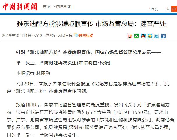 而“雅乐迪配方粉” 涉嫌虚假宣传虽然没有看到后续的处罚,但相关公司被立案调查,国家市场监督管理总局也严肃表态: