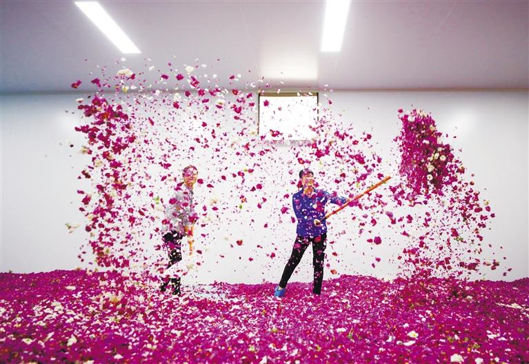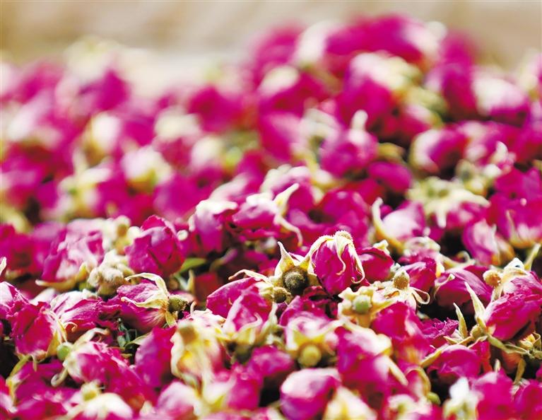 了解了玫瑰的历史和价值后,走进苦水镇的农家小院里斟一盏玫瑰茶,闻茶香浮动,再尝尝农家小院用玫瑰酱自制的烫面玫瑰饼……玫瑰易谢,一枝枝含苞的玫瑰变茶、变酱,伴随四季,这就是苦水镇予你的馈赠。 记者 荆雯