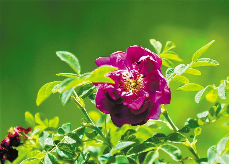 远望玫瑰花田,像一匹匹玫瑰色的绸缎,大片浓绿之中藏着无数玫红色的花蕾,欲摘一朵,可要小心一根根扎人的刺儿。据苦水镇陪同的工作人员介绍,“永登境内的玫瑰花因地势高低不同,花期也略有差异,苦水镇的开花最早,相邻的红城镇相对较晚……正是因为长期处于高海拔、寒冷、干旱少雨的生长环境中,形成了‘苦水玫瑰’特有的品质。”