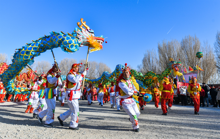 2024年2月14日,甘肃省敦煌市社火队正在白马塔景区进行社火——舞龙表演。