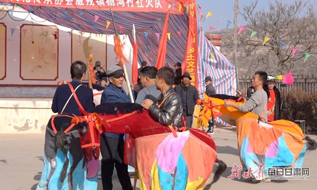 同样,严寒的天气也不能阻止威戎镇杨湾村传统社火文化项目“耍马”的排练,村文化活动广场上,参加排练的村民个个热情高涨,全身心投入,他们手舞彩扇,驾着精心制作的“花马”,踏着欢庆的鼓点,尽情地欢舞,欢声笑语荡漾在村庄上空,呈现出一派喜迎新春的热闹景象。