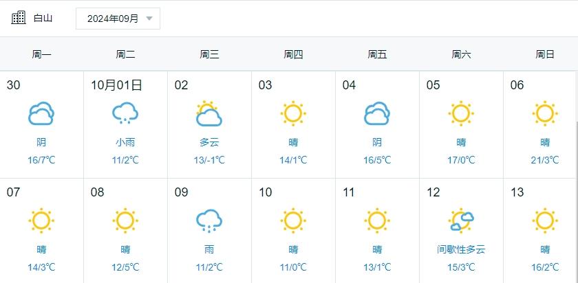 十一期间,除10月1日有小雨天气,白山地区其他时间天气都较为晴好。由于进入秋季,受昼夜温差较大影响,辖区高速公路多发团雾,请广大驾驶员朋友,出行注意观察、减速慢行,确保安全。