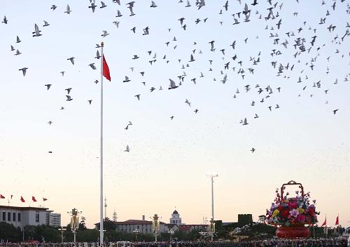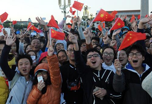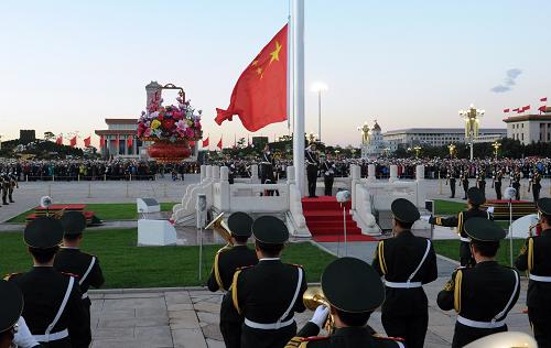 10月1日,天安门广场举行升国旗仪式。当日清晨,来自全国各地的各族群众在北京天安门广场观看升国旗仪式,庆祝中华人民共和国成立66周年。新华社记者 邢广利 摄