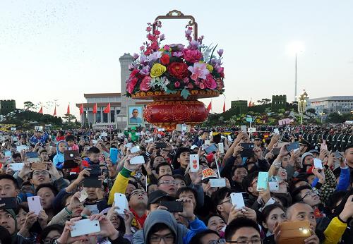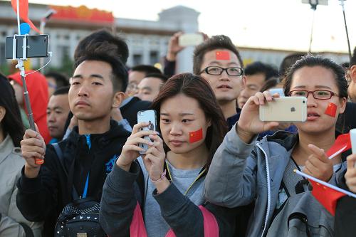 10月1日,群众在天安门广场观看升国旗仪式。新华社记者 邢广利 摄