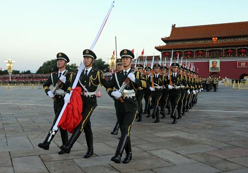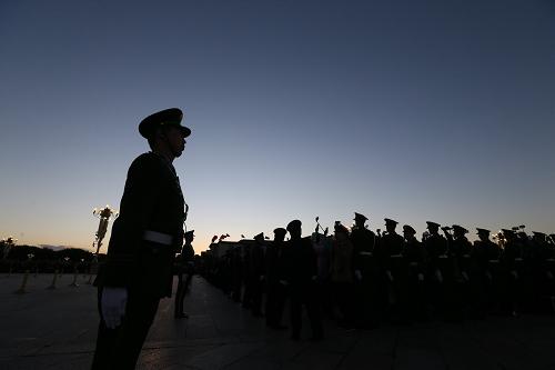 10月1日清晨,武警天安门支队的官兵在执勤。新华社记者 邢广利 摄