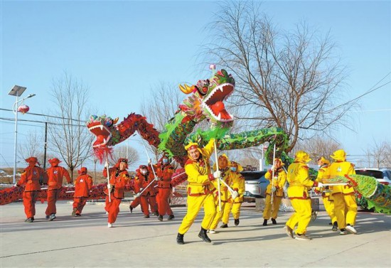上午9時許,隨著一陣鼓樂聲響起,村民們身穿鮮艷的社火服裝,頭戴五彩頭飾,手舞彩扇,腰系彩帶,踏著歡樂喜慶的鼓點,熱火朝天地排練著社火節目。大家個個精神抖擻、神採飛揚。現場兩條“長龍”時而騰空躍起,時而蜿蜒低潛,時而翻滾盤旋﹔舞獅隊中的獅子縱跳、打滾、扑跌,姿態百變。一時間,鑼鼓聲、掌聲、喝彩聲、歡笑聲匯成一片。