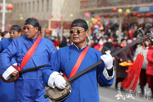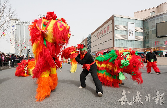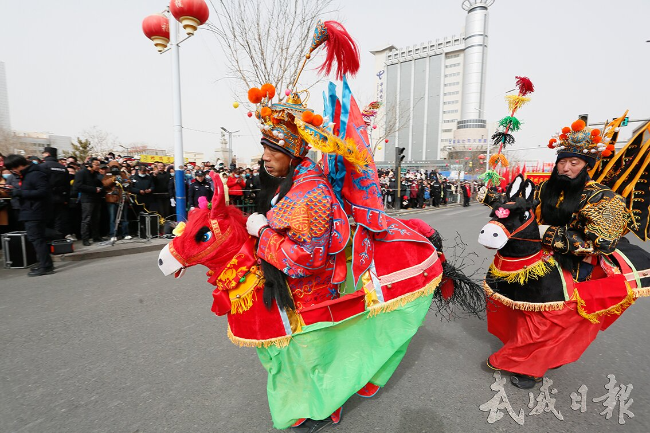 锣鼓喧天、欢声鼎沸。从天丰街到文化广场,从雷台什字到天马湖畔,虽寒意料峭,却仍有春意盎然——铿锵有力的锣鼓、上下翻飞的彩扇、欢腾跳跃的龙狮,经典的扮相、喜庆的服饰、幽默的互动,一队队各具特色的社火合着鼓点尽情舞动。