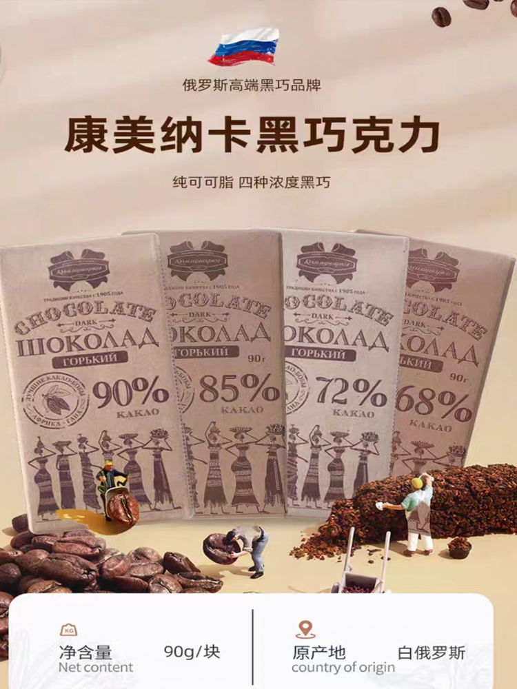 俄罗斯进口康美纳卡90%85%72%68%牛奶纯可可脂苦黑巧克力健身零食