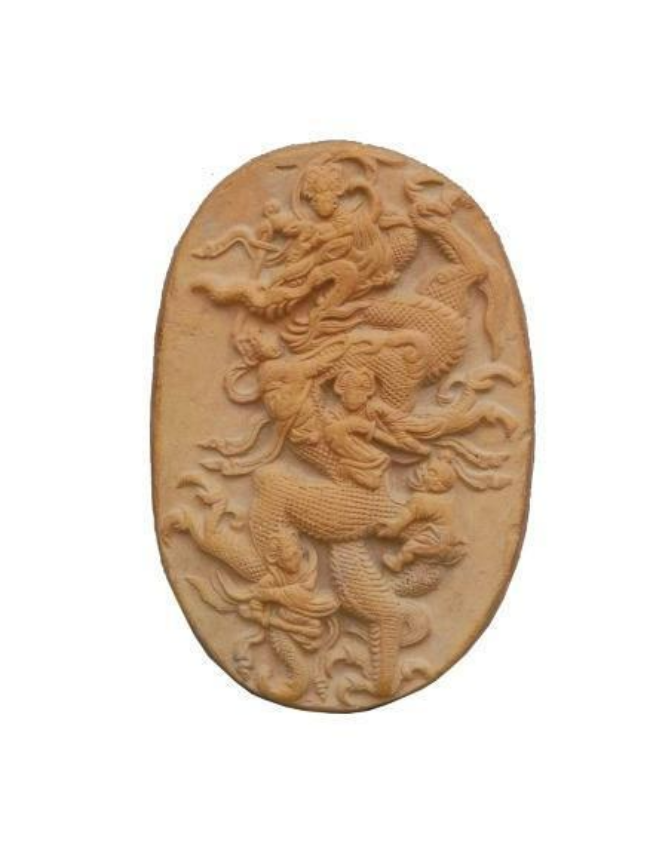 1990年出土于庄浪县水洛镇寺坪塬遗址。高11.7厘米,宽7.9厘米,厚1.5厘米,呈椭圆形。泥质红陶,背面平素。画面表现的是某神话故事,正面饰浅浮雕纹饰,正中为一巨龙张牙舞爪、怒目圆睁、奋力腾空,一女神左手紧抓龙角,右手持剑欲砍龙首;龙颈部有一女神拿绳索套缚,另一女神在龙胸部作拔剑状;一力士则用力拽龙尾,凸目张嘴,声色惊恐万分;在龙的后肢旁还有一女神右手握剑砍杀。五神皆神态各异,造型逼真,生动表现了五神伏龙时惊心动魄的场景。
