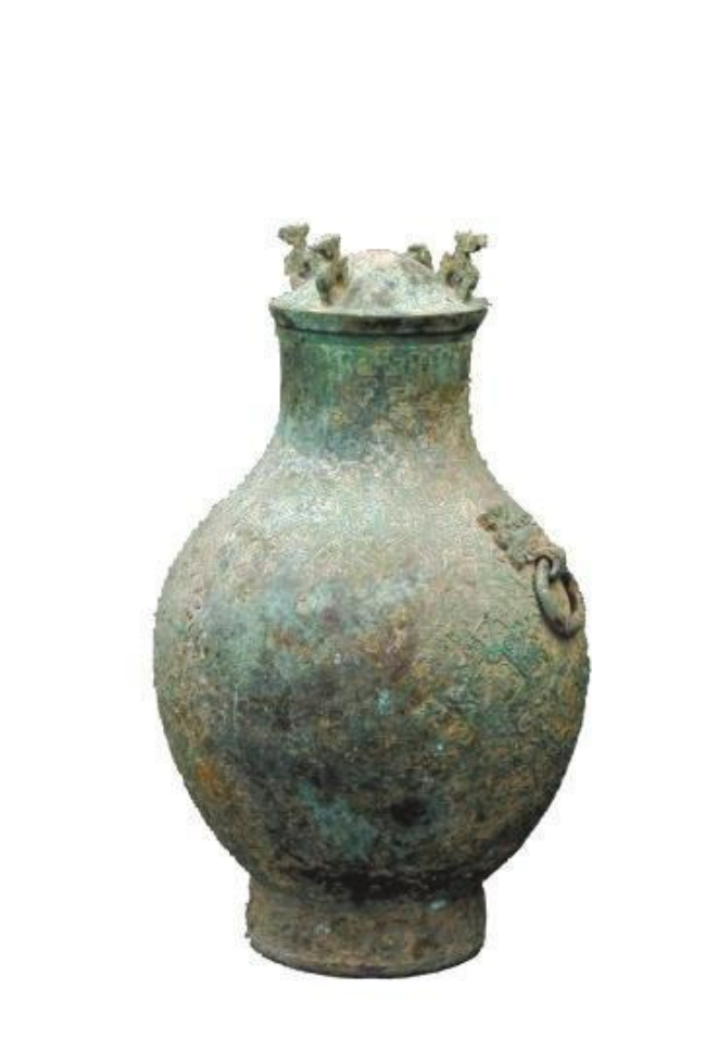 1986年出土于甘肃省陇南市两水镇,为战国时期盛酒器,国家一级文物,也是陇南市博物馆镇馆之宝。大铜壶为拱状圆顶环状千龙鸟纹盖系,其下有牙子盖,壶体平口唇,长颈,圆鼓腹,高圈足,肩部有两铺首饰环,其一丢失。唇带无饰,颈、肩、腹部全施菱形交叉组合之反复相间的变形龙凤纹的主体图案。肩部有兽面衔环耳,可以清晰看到怪兽的眼睛。其空间坠饰以花叶云气勾连纹饰。近底部有一圈宽圈带纹。高圆足部有两道带纹。大铜壶通体纹饰复杂,以凤纹为主,表明铜壶等级较高,保存非常完好。
