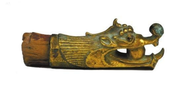 肃南裕固族自治县马蹄乡二夹皮村出土。长19.3厘米,铜质,鎏金。形状为龙头,颈部中空,龙头部分为独角,龙眼暴睁,上唇卷起,口内含有一圆球。颈部龙发呈条形状。
