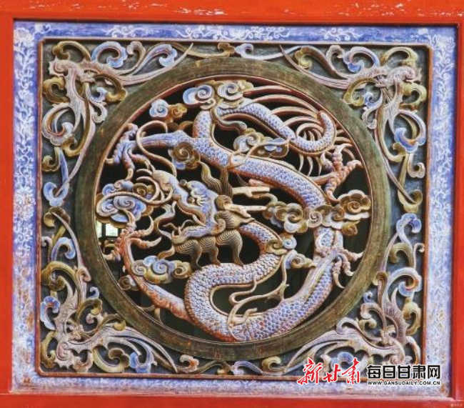 天水伏羲庙位于天水市秦州区西关伏羲路,是目前我国规模最宏大、保存最完整的纪念伏羲氏的明代建筑群,1963年被列为甘肃省重点文物保护单位。伏羲庙中有一对龙凤槛窗木雕,是明代木雕中天水雕刻技法传世至今的佳作,约有500年历史。当时匠人将多块油松木板拼接成方形,再以透雕技法在框内圈雕圆形,中刻龟背舞凤,外饰祥云蝙蝠,龙凤雀跃,惟妙惟肖,最后用矿物颜料上色点睛。龙凤槛窗木雕将艺术性和功能性完美统一,承载了诸多文化寓意。有学者认为,这组木雕的图案既歌颂了伏羲开创中华文明的丰功伟绩,又体现了对古文化的一脉传承。