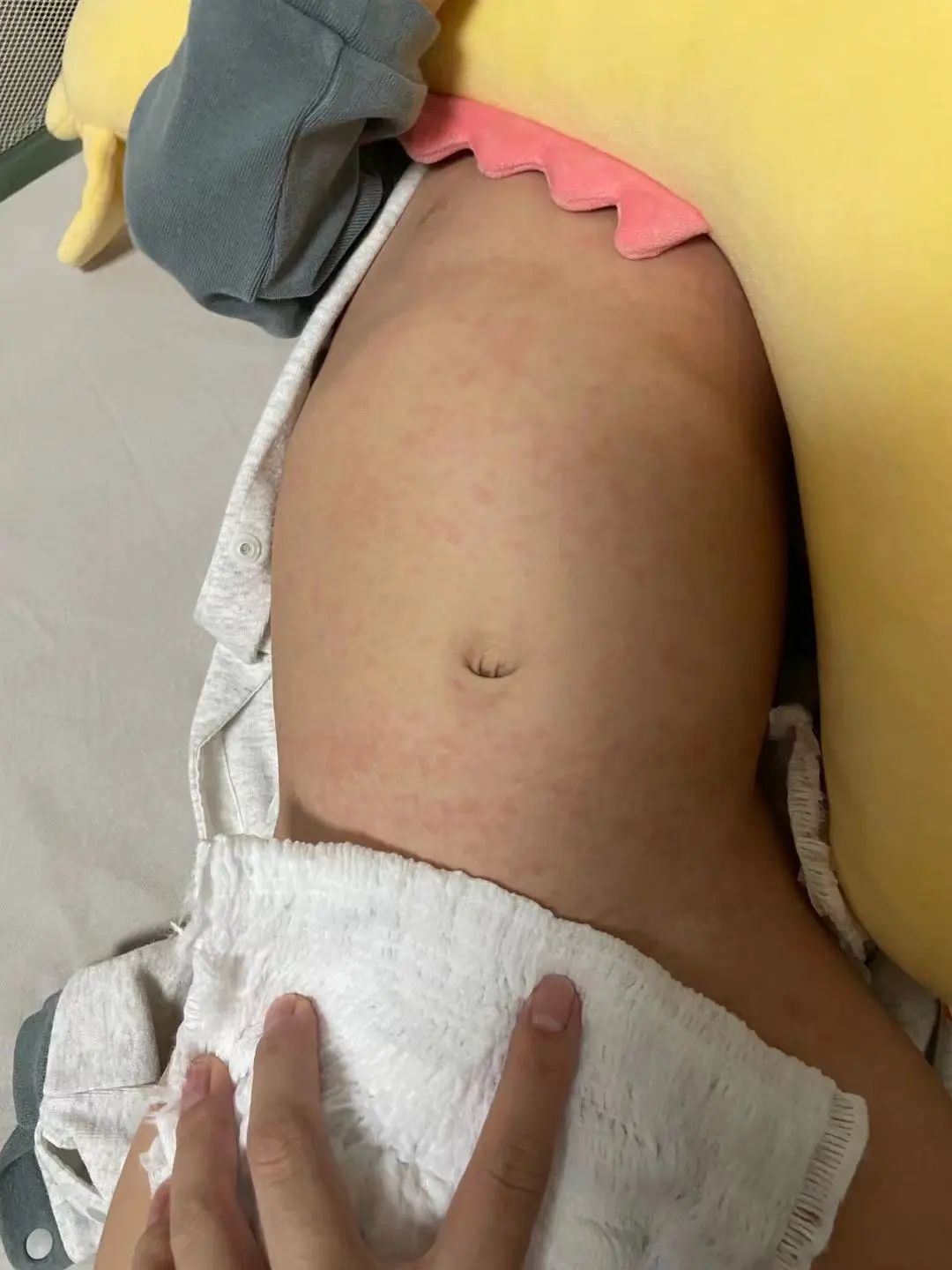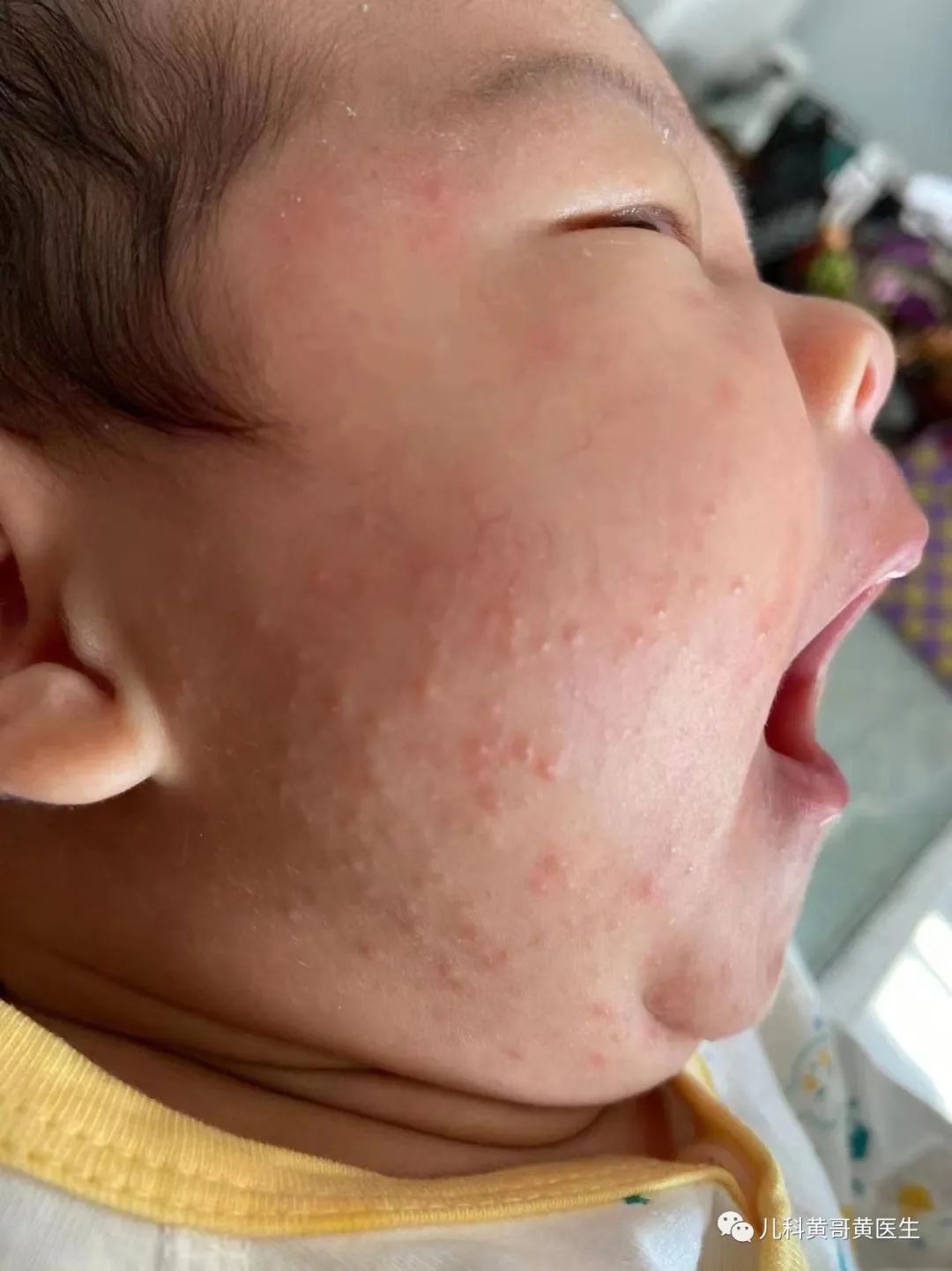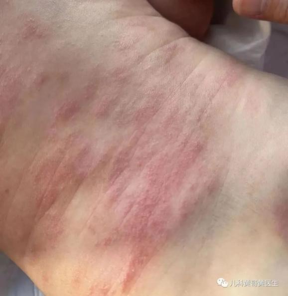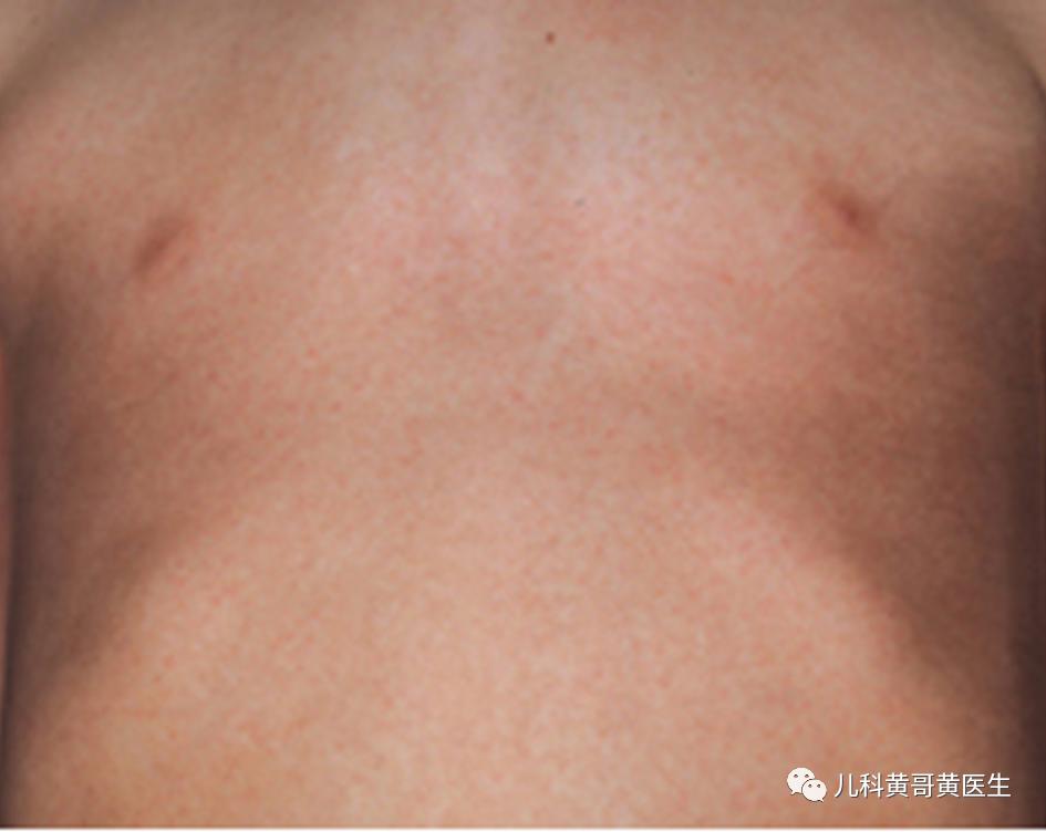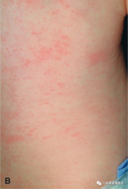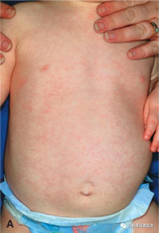 特点:发热3~5天后热度突然下降,皮肤出现玫瑰红色的斑丘疹,病情减轻。黄医生总结了8个字,幼儿急疹,热退疹出。