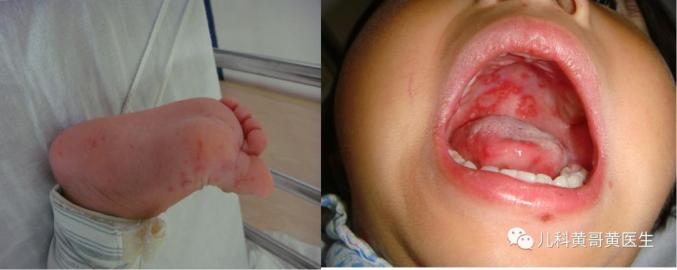 可以看到这个孩子脚底板疱疹、口腔疱疹、舌头上也会疱疹。痛啊!手足口病。