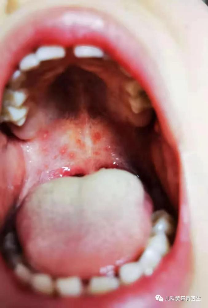 口腔的上颚许多红色水泡,舌苔很厚,有时候舌头上也有疱疹,疱疹性咽峡炎可能了。