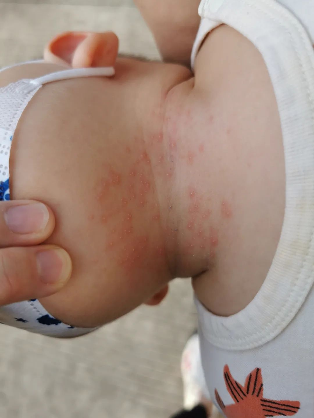 痱子最容易出现在闷热、容易出汗的地方,而湿疹容易出现在干燥摩擦的地方,也就是皮肤裸露处,从这点也能大体的区分下,大家可以看看下面的图片:
