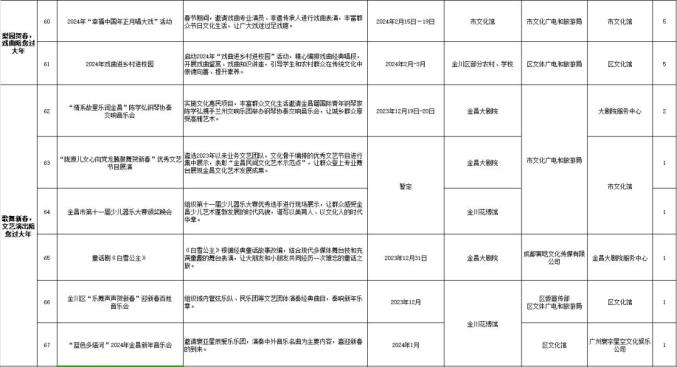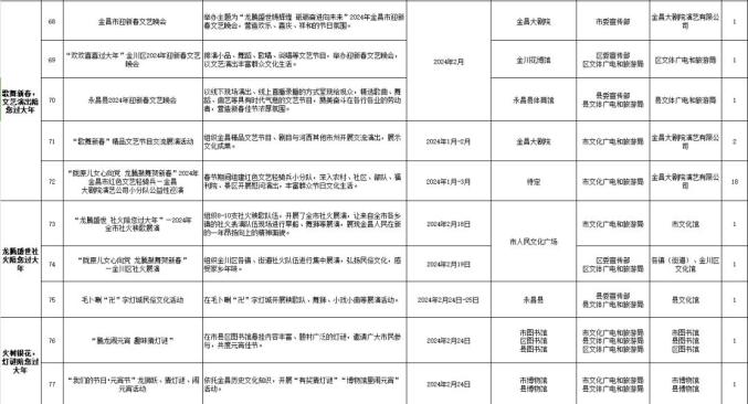 聚焦丰富农村群众精神文化生活,激发乡村振兴文化活力,策划老百姓自编自导、自演自赏的“冬季村晚陪您迎新春”金昌市村晚示范性展示活动、金川区秧歌广场舞展演暨“村晚喊你回家过年”“大地欢歌”2024年春季村晚三场乡村“村晚”,把关注乡土、承载乡音、凝聚乡情的文化产品,搬到老百姓“家门口”。