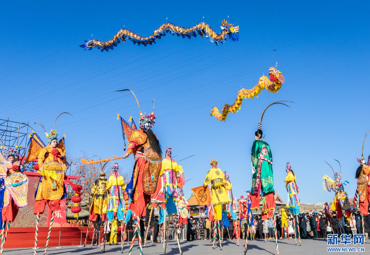 2月3日,民间艺人在呼和浩特新春文化庙会上表演高跷。新华网发(丁根厚 摄)