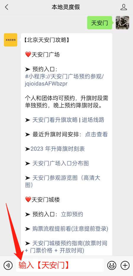 通过“本地灵度假”公众号,留言回复“天安门”也可获取“天安门广场预约参观”小程序预约入口。