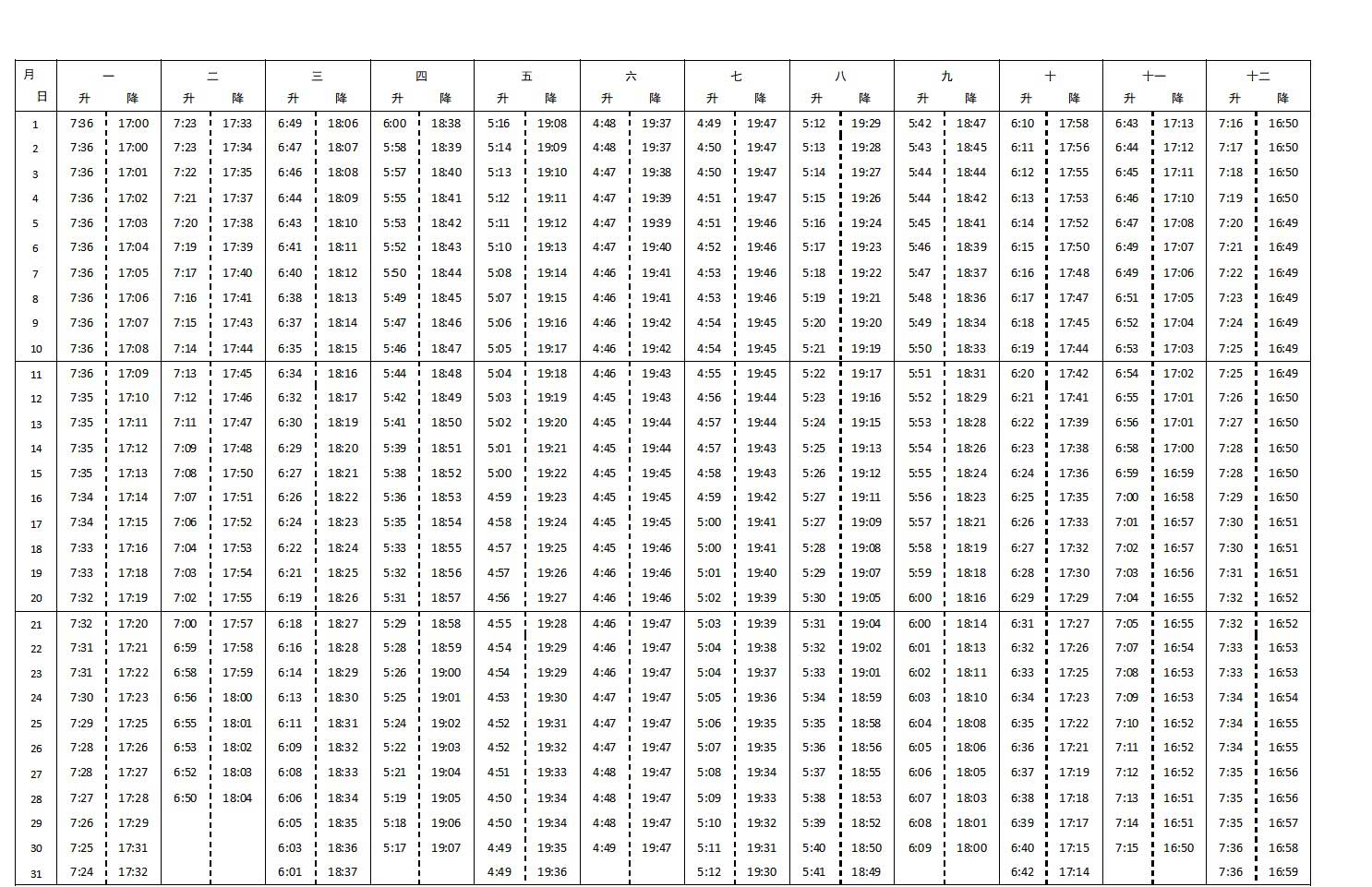 天安门广场升旗仪式每天都进行,早上升国旗,晚上降国旗。升降国旗全年时间表如下: