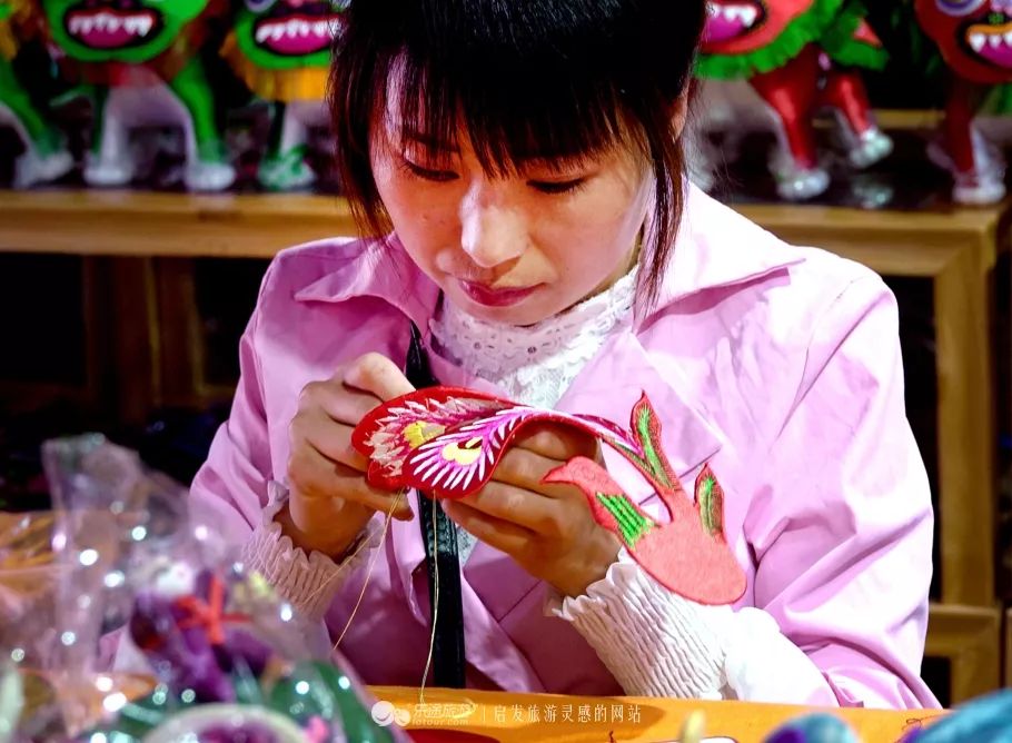 过去,庆阳的女孩子如果不会针线活是嫁不出去的,因此她们个个心灵手巧,“八岁学针线,十岁进绣房,进了绣房绣鸳鸯,百样故事都绣上”就是真实的写照。庆阳锦绣坊文化街区是生产、展示、销售庆阳香包的基地,岐黄文化传播公司不仅在这里开设了“生产性保护基地”,同时在乡下也建立了若干个工作站,是脱贫的一条有效渠道。忙完农活到工作站绣一绣香包,成为了很多农家妇女的生活习惯。