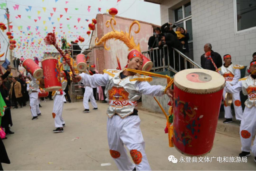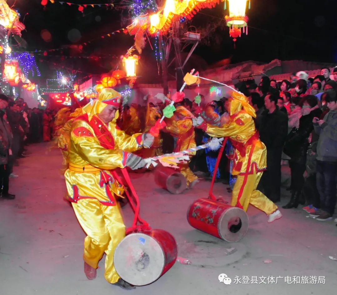 永登被称为兰州太平鼓的故乡,1986年永登河桥乐山坪出土的马家窑文化彩陶鼓被史学界称为兰州太平鼓的鼻祖。永登太平鼓是传统社火中的压轴节目,在各社火队中都有,阵容庞大,气势磅礴。太平鼓长80厘米、直径30厘米的圆柱体,筒壁由质地优良的松木扳箍成,两端蒙以牛皮,鼓筒外壁漆成黑色或深红,上画传统的龙、凤、潮水、红日等图样;鼓筒两端距鼓面约10厘米处各装一铁环系背带用;鼓面一般画太极图。鼓手左手执绕鞭,右手执鼓鞭,背带由右肩斜挎至右膝下置鼓于左小腿下部离地约0.7厘米。击鼓时右手自左前方抡起经头顶划一弧线击在鼓面,同时左手反向抡起落于左后方,一步一击。鼓队前面有两付钹引导,队中间有锣、钹,领队击钹指挥队形,击钹者左手上右手下,铜钹金光闪闪,鼓鞭彩虹飞舞。鼓队的节奏则由长杆(2.5米)小红旗一前一后指挥,鼓队单列行进时旗手位于队中里手,双列行进时旗手位于双列正中。