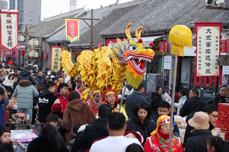 当日是农历大年初一,濉溪古城举行“民俗踩街闹新春”巡演活动,民间艺人们通过“踩街”巡游的形式,表演舞龙、骑毛驴、大头娃娃、划旱船、独杆轿等丰富多彩的传统民俗文化项目,让游客感受到祥和喜庆的节日氛围。(摄影 记者 黄鹤鸣)