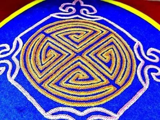 “‘扩日洛’纹样在土族传统文化里寓意富贵长寿。每种色彩要从深到浅配十多个色级的绣线,只有这样才能配色协调、鲜艳夺目。”李发秀介绍,除此以外,土族盘绣还包括太极图、五瓣梅、神仙魁子、云纹、菱形、雀儿头、人物、佛像等几十种样式。
