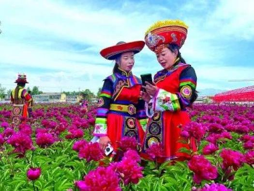 青海省互助县卓扎滩村的绣娘们在田间拍照采集土族盘绣图案。陈煜摄