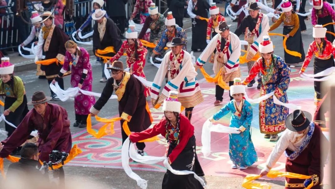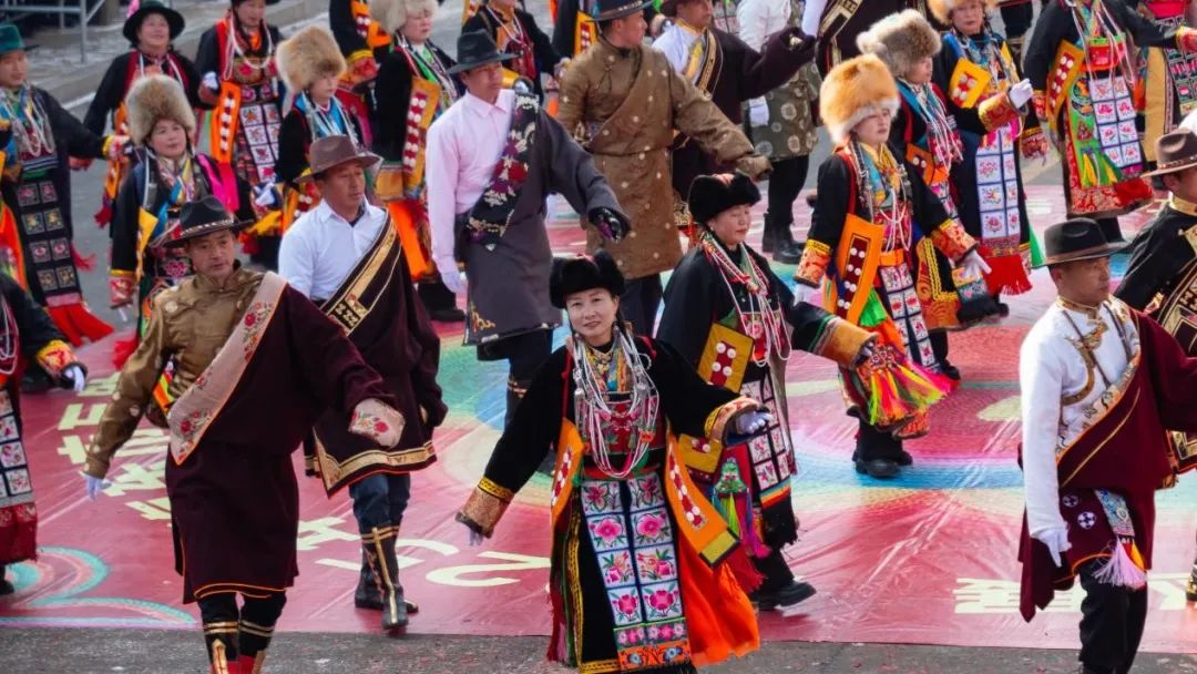 踏着欢快的鼓点,各族群众身着节日盛装,土族服饰色彩鲜艳,太阳花纹样在阳光照耀下熠熠生辉;藏族服饰淳朴敦厚、华丽典雅,展示着藏族文化的独特韵味。
