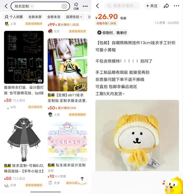 此外,这类商品一般是先接订单,再安排织女制作。一位编织品商家表示成熟的“织女”一天可制作5件左右的娃衣,库存风险低。目前,闲鱼店铺的娃衣售价普遍在50-120元,基础款的娃娃帽子单价也达25元。