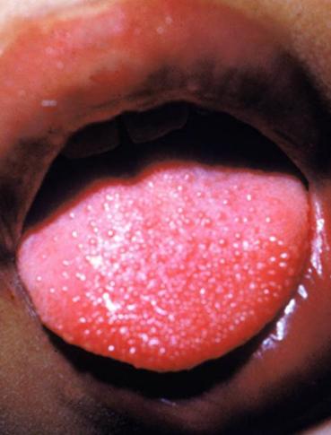(2)口唇及口腔变化:口唇干红,草莓舌,口咽部黏膜弥漫性充血;