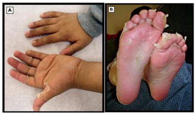 (4)四肢末梢改变:急性期手足发红、肿胀,恢复期甲周脱皮;