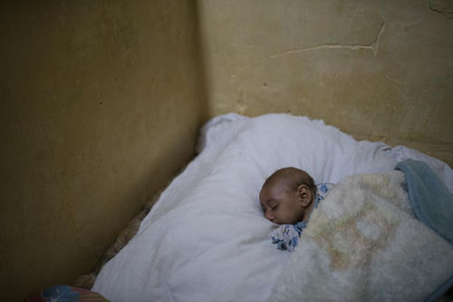 2016年1月30日,若泽在一个大大的枕头上睡着了。他的体重从一个月前的7公斤降到了5公斤。体重骤降对成长中的婴儿来说极不正常。(美联社图片)
