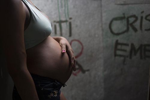 2016年1月29日,21岁的洛伦索站在位于累西腓贫民窟的自家入口处,扶着日渐隆起的肚子。洛伦索目前怀孕5个月,处在失业状态。(美联社图片)