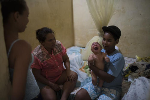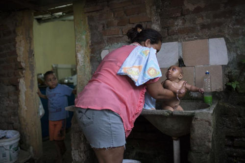 2016年1月30日,费雷拉在博尼图镇的家中给若泽洗澡。镇里的卫生状况同样令人担忧,飞舞的蚊虫在这里肆意传播着寨卡、登革热、基孔肯雅热等病毒。(美联社图片)