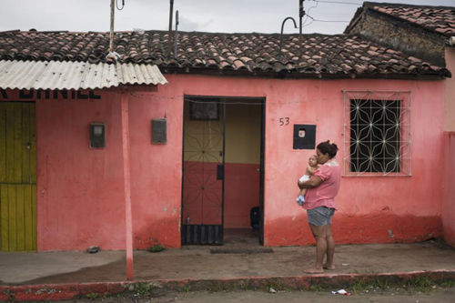 2016年1月30日,若泽的母亲费雷拉抱着他,站在位于博尼图镇的住所外。费雷拉说,博尼图镇距离州首府累西腓更近,方便若泽就医。费雷拉的丈夫现在还留守在蚊虫肆虐的老家。蚊虫叮咬是寨卡病毒传播的重要方式之一。(美联社图片)