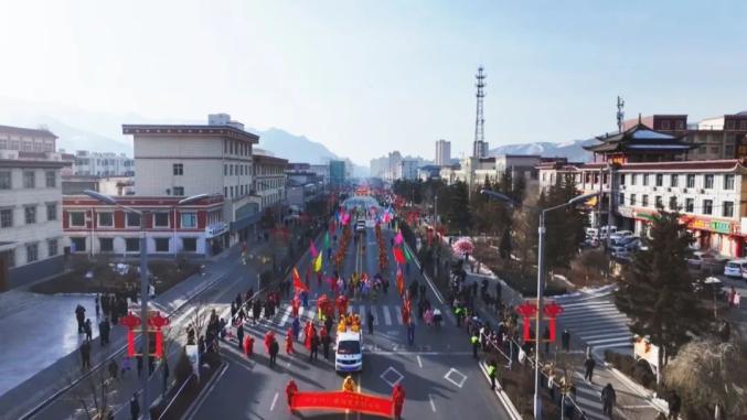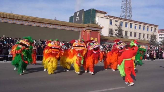 天祝县松山镇社火展演队队员 马良海:今天是一年一度的元宵佳节,我们举办以太平鼓、舞狮、舞龙为主题的社火展演,祝全县的父老乡亲生活愉快、万事如意、扎西德勒。