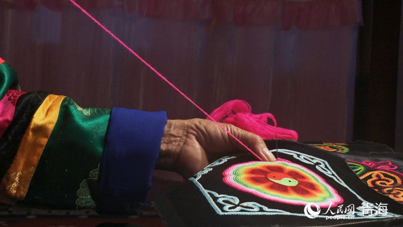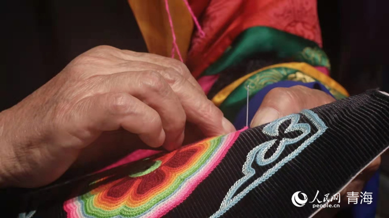 2006年,土族盘绣被列入第一批国家级非物质文化遗产名录。“我们盘绣不用棚架,直接用双手操作,绣者左手拿布,右手拿针,作盘线的那根线别在右胸,作缝线的那根线穿在针眼上。”土族盘绣的代表性传承人李发秀介绍说,盘绣的针法十分独特,操作时同时配两根色彩相同的线,一作盘线,一作缝线,虽费工费料,但成品胜在厚实华丽,经久耐用。而李发秀的刺绣针法细腻多变,配线色彩明快大方,更是广受好评。