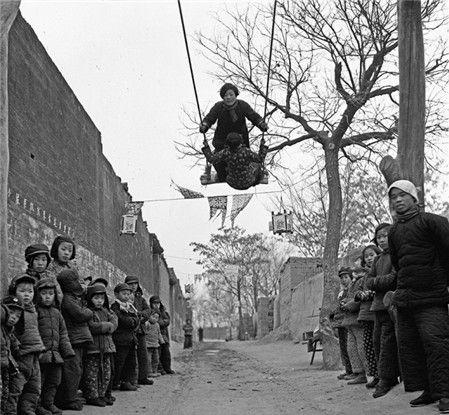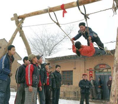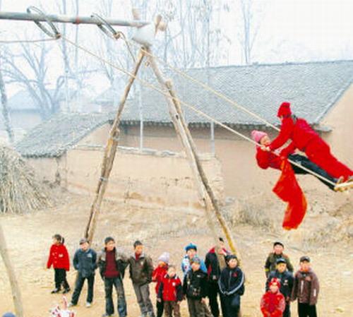 进入农历正月,临夏山村的大树间,一架架秋千架起,开始了一年一度的打秋千游戏。打秋千,有两种基本姿式,一是自己坐在横板上,由别人在后面送,悠悠晃晃,飞得不太高,这种姿式适合于年幼儿童;二是站立在横板上,自己用力,使秋千快速飞升,这种姿式最受大人青睐。