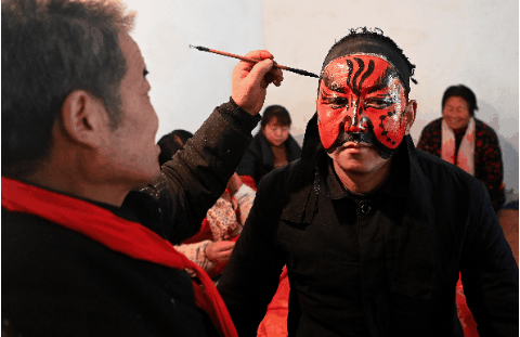2月23日,陕西省宝鸡市陇县东南镇的社火队伍在演出前化妆。新华社记者 刘潇 摄