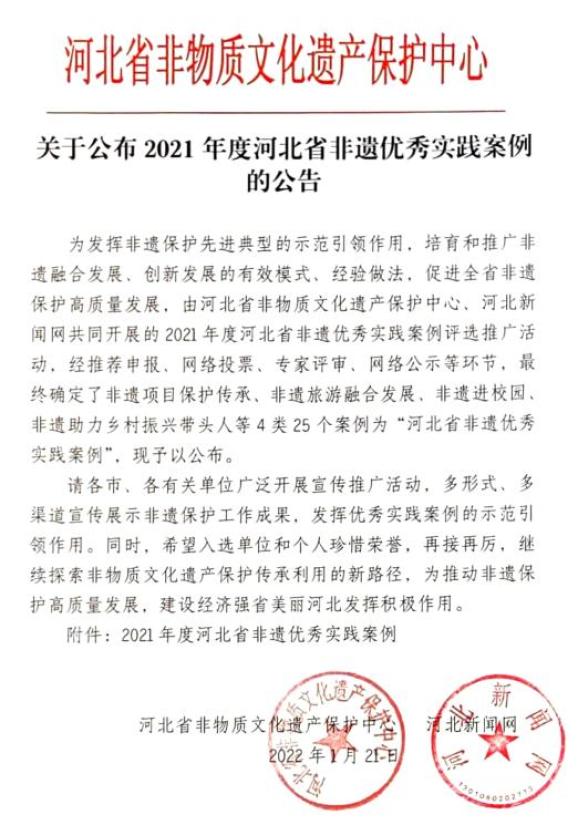为发挥非遗保护先进典型的示范引领作用,培育和推广非遗融合发展、创新发展的有效模式、经验做法,促进全省非遗保护高质量发展,由河北省非物质文化遗产保护中心、河北新闻网联合举办的河北省非物质文化遗产优秀实践案例评选推广活动,经申报汇总、网络投票、评委打分等程序,共推选25个项目和带头人为“河北省非物质文化遗产优秀实践案例”。我县“全民传承 共享非遗——井陉拉花遍地开”和“赓续延传 守护乡愁——桃林坪花脸社火”2个项目成功入选。