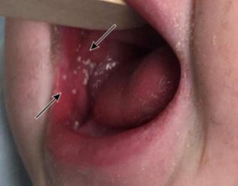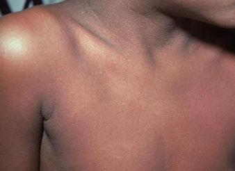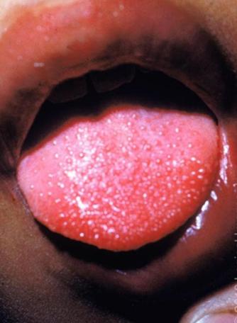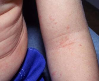 皮疹通常始于腹股沟和腋窝,并伴有口周苍白和草莓舌(图7)。随后,皮疹迅速蔓延至躯干,然后蔓延至四肢(图8),最后脱屑;常在肘前窝和腋下皱襞呈现出线状淤点,称为“帕氏线”(图9)。